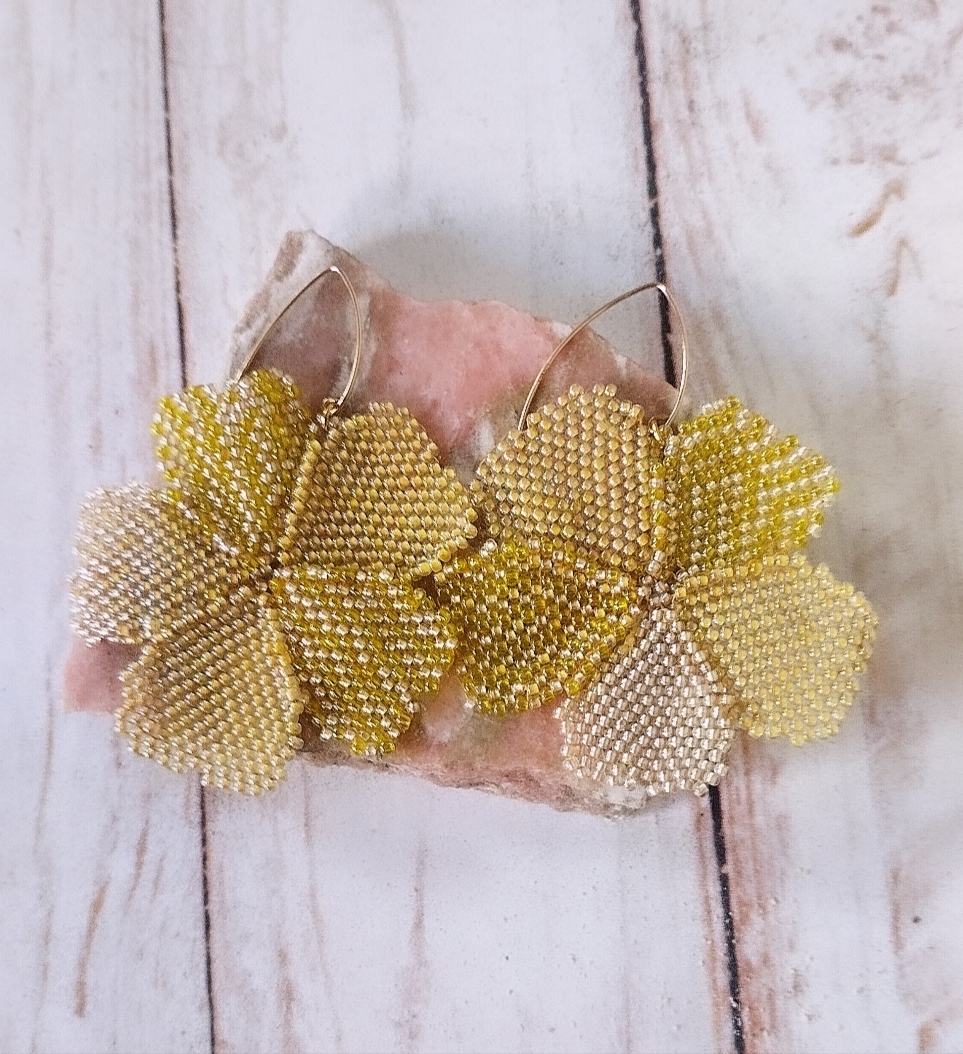 Réalisées en perles Miyuki rocailles, elles offrent un rendu fin et régulier. Le tissage minutieux permet de former une fleur structurée, avec un travail précis qui met en valeur chaque détail.