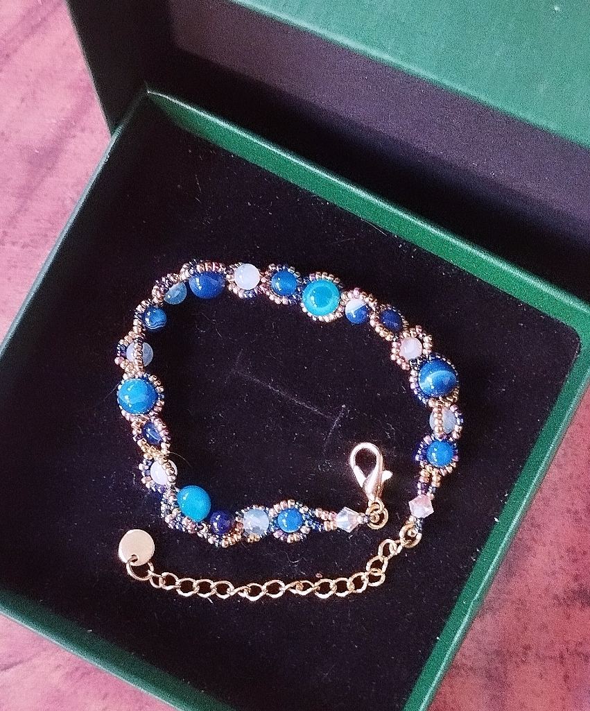 Des agates bleues qui n’ont pas la même couleur, des perles myuki rocailles dorées (de taille 15/0).