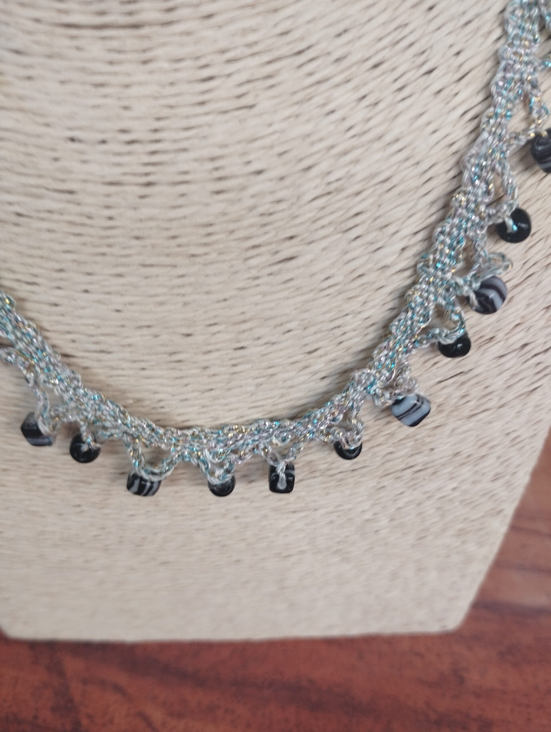 Collier fuseau dentelle argenté bleu cubes noires